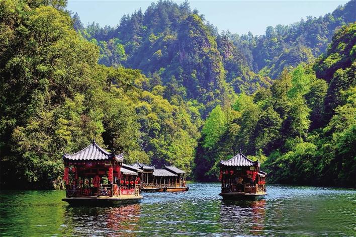 在景区船埠,搭客们登上古色古香的画舫游船,穿行于高峡平湖之间,两岸绿意葱茏,峰林叠翠,湖水碧绿,宛如一幅流动的春日山水画卷。游船上,土家阿妹的牧歌婉转激荡,与山光水色妙不可言,引得搭客们纷繁拿最先机记载这好意思好顿然,不少搭客随着歌声轻轻哼唱,千里浸式感受湘西习尚文化的魔力。