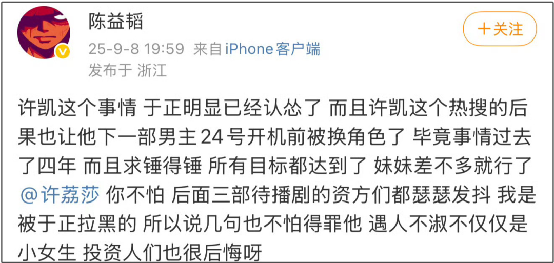 但立时画风一排,暗意投资方和许荔莎通常遇东说念主不淑齐很后悔,还称三部待播剧的投资方齐瑟瑟发抖,我方出来发声则是因为也曾被于正拉黑,不怕得罪他。究其贪图,不是给许凯倒油,而是给投资方语言有计划怜悯心,让许荔莎部属原宥。之后制片东说念主又删除了,把水搅得更乱。