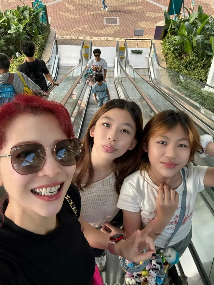 一家五口在扶手电梯上合影,蔡少芬和两个女儿在前边,张晋和小男儿紧随背面。14岁的楚儿和12岁的信儿出落得窈窱淑女,不仅身高长得像姆妈相似高挑,样式也齐很像姆妈,齐是漂亮小小姐。