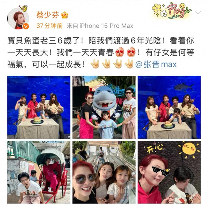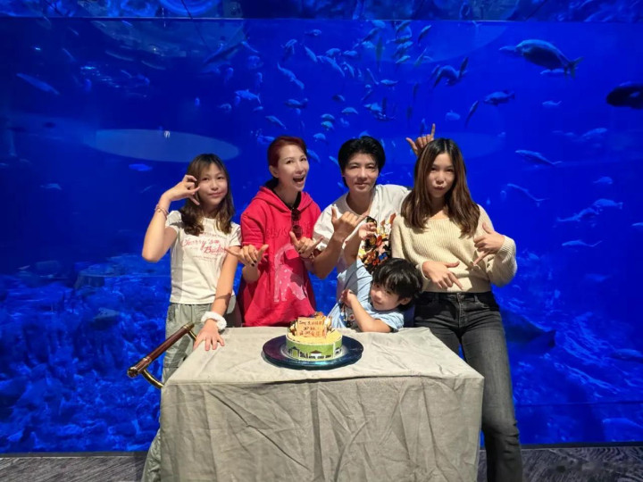 相片中,只见一家五口去到海洋公园庆生,以海底宇宙为配景全部吹烛炬、切蛋糕,并拍下全家福相片。蔡少芬身穿红色卫衣套装,打扮显年青。张晋身穿白色t恤,帅气有型。大女儿楚儿衣着白色毛衣和牛仔裤,二女儿信儿衣着辣妹t恤和工装裤,姐妹俩打扮芳华飘溢。小寿星鱼蛋身穿蓝色t恤,帅气可人。