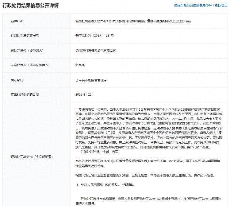 11月26日,苍南县市集监督措置局对温州告捷港耀自然气有限公司作出行政处罚,因其未按规按时限更换计量工具且落伍未改正,照章对该公司处以1.1万元罚金。