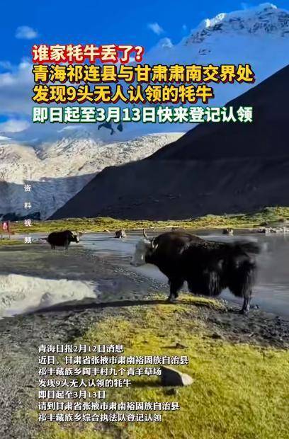 2月12日,甘安闲南裕固族自治县祁丰藏族乡东谈主民政府发布公告,吁请认领9头无主牦牛,不然一个月后将照章处理变卖。13日上昼,极目新闻记者采访获悉,公告今日9头牦牛已一皆被认领。