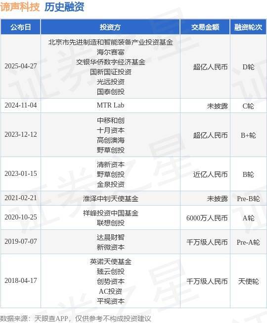 证券之星音讯,凭证天眼查APP于4月27日公布的信息整理,北京谛声科技有限背负公司D轮融资,融资额超亿东说念主民币,参与投资的机构包括北京市先进制造和智能装备产业投资基金,海尔赛富,交银华裔数字经济基金,国新国证投资,光远投资,国泰创投。